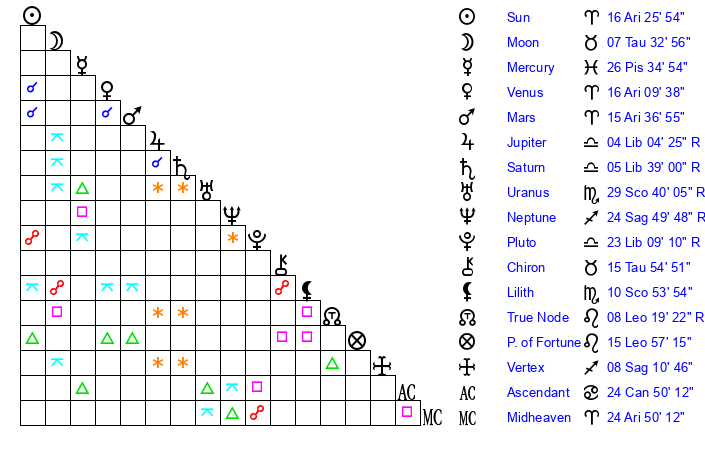 Sun | 16 Aries 26 | 16 Aries 46 | 29 Taurus 13 |