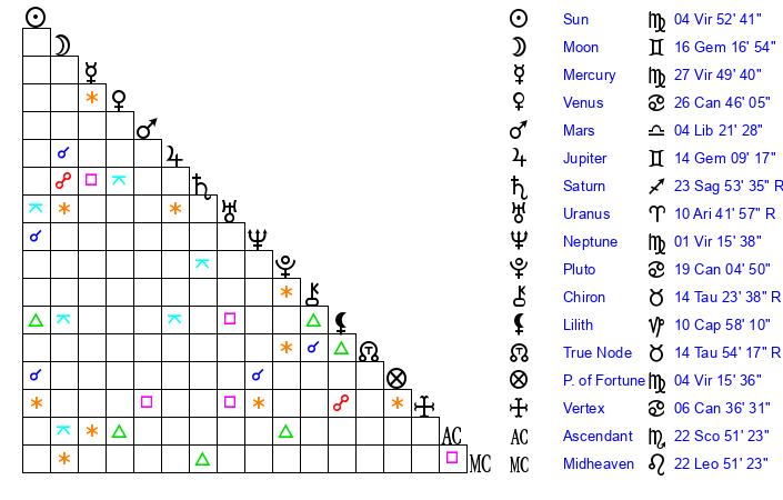 | Moon | 16 Gemini 11 | 7 Scorpio 46 | 26 Sagittarius 45 |