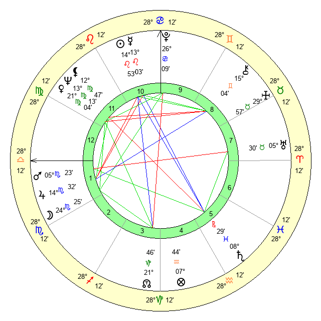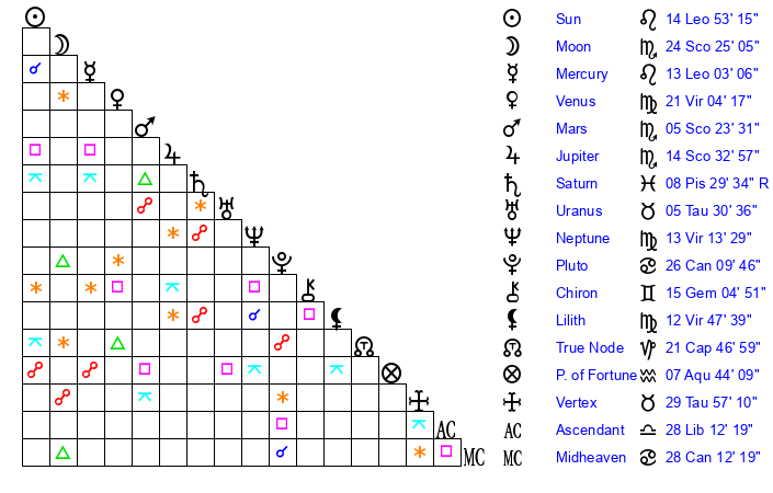 | Sun | 14 Leo 53 | 16 Leo 5 | 13 Scorpio 1 |