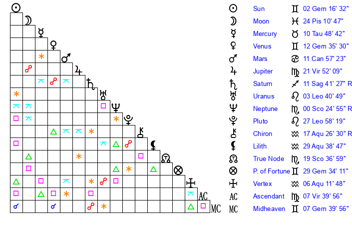 | Sun | 2 Gemini 16 | 2 Gemini 49 | 7 Leo 14 |