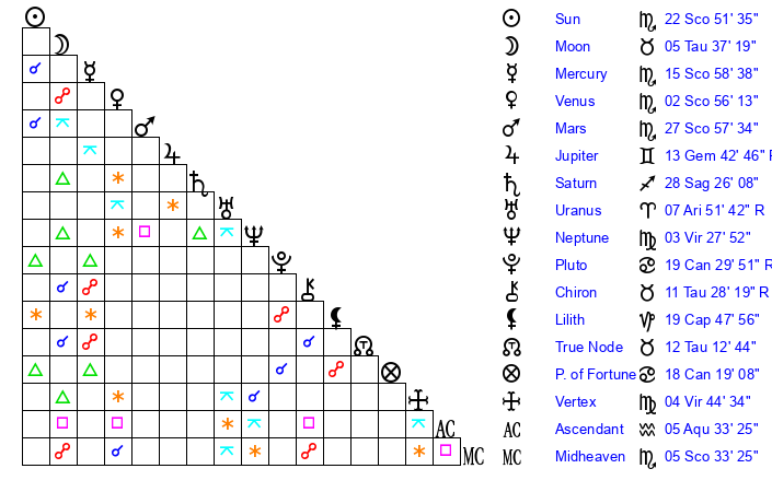| Moon | 5 Taurus 37 | 3 Libra 37 | 22 Scorpio 45 |