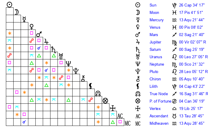 | Sun | 26 Capricorn 34 | 27 Capricorn 50 | 6 Aries 0 |
