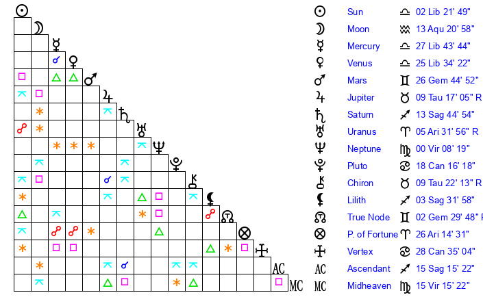 | Moon | 13 Aquarius 18 | 15 Scorpio 55 | 15 Virgo 11 |