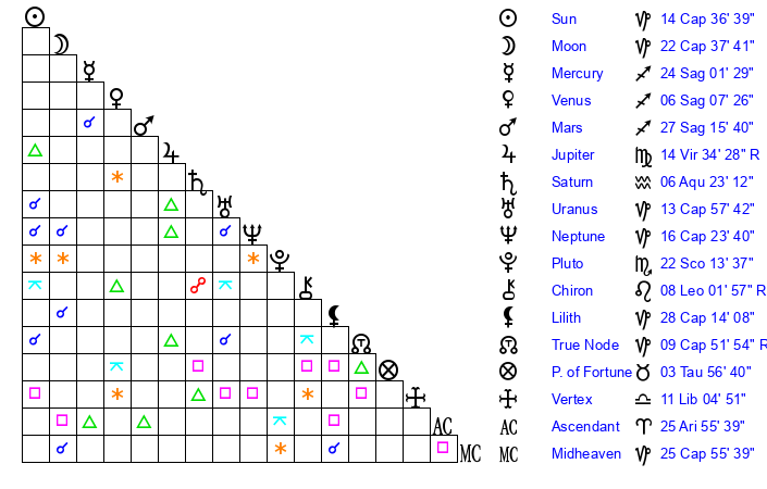 | Sun | 14 Capricorn 36 | 15 Capricorn 37 | 18 Aquarius 10 |