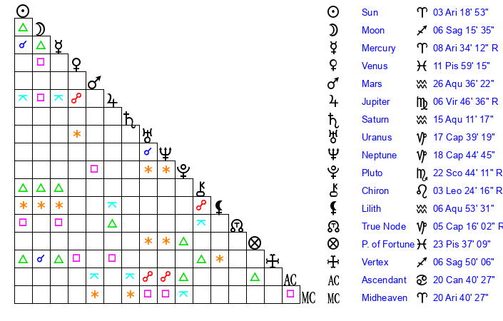 | Pluto | 22 Scorpio 43 | 3 Aquarius 24 | 22 Scorpio 0 |