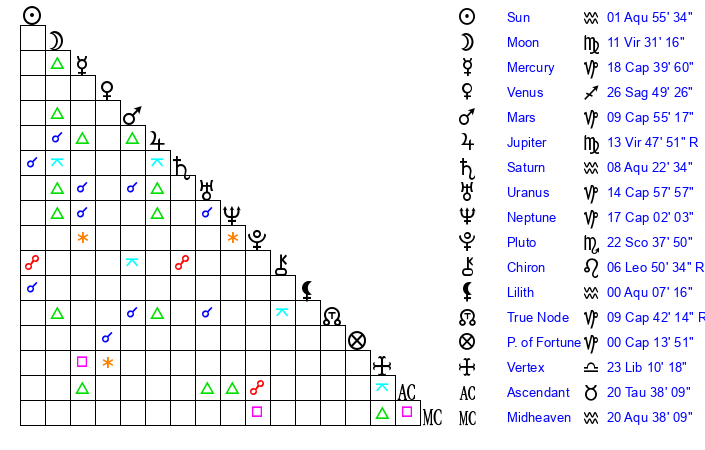 | Saturn | 8 Aquarius 22 | 16 Pisces 23 | 12 Aquarius 15 |
