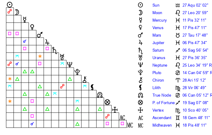 | Neptune | 25 Leo 34 | 28 Pisces 27 | 24 Leo 18 |
