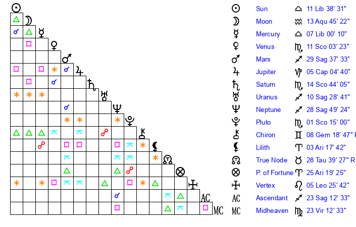 | Neptune | 28 Sagittarius 49 | 0 Aries 26 | 29 Sagittarius 47 |