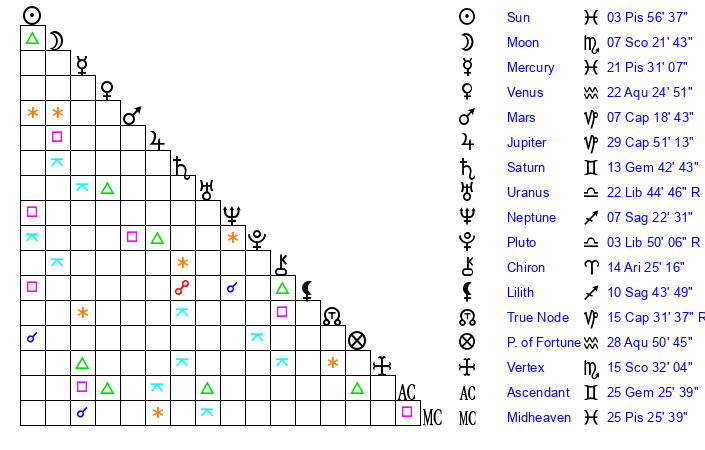 | Sun | 3 Pisces 56 | 4 Pisces 19 | 25 Aries 34 |