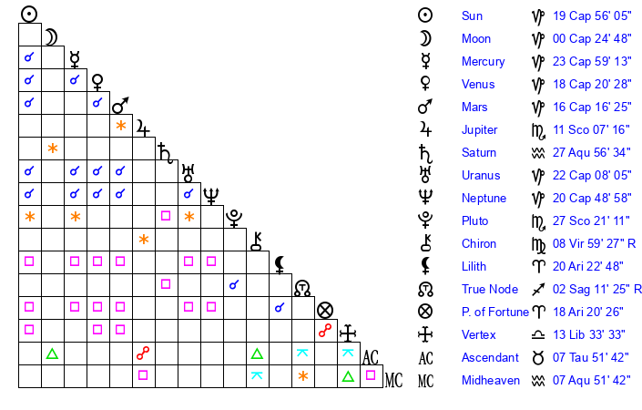 Moon | 0 Capricorn 26 | 5 Gemini 21 | 19 Aquarius 9 |