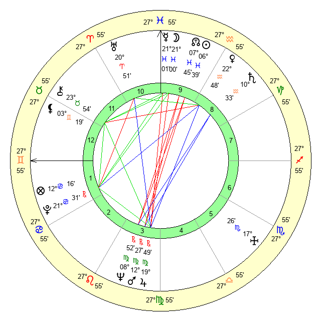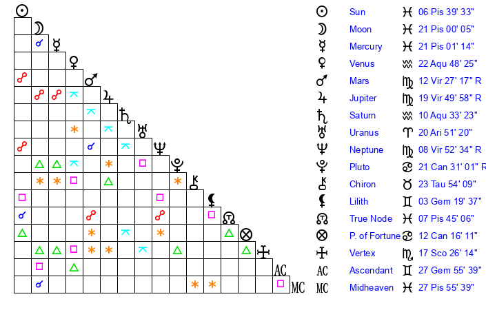 | Moon | 20 Pisces 55 | 6 Aquarius 26 | 23 Cancer 43 |