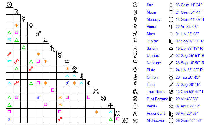 | Venus | 22 Aries 53 | 18 Aries 8 | 13 Gemini 17 |