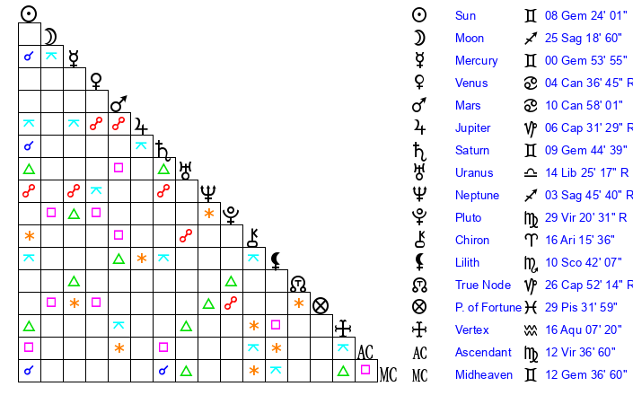 | Moon | 25 Sagittarius 24 | 14 Cancer 10 | 6 Sagittarius 7 |