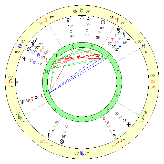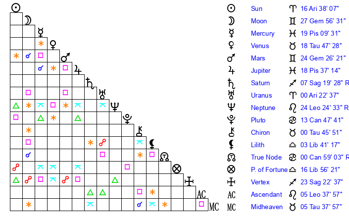 | Moon | 27 Gemini 59 | 16 Leo 13 | 16 Capricorn 40 |