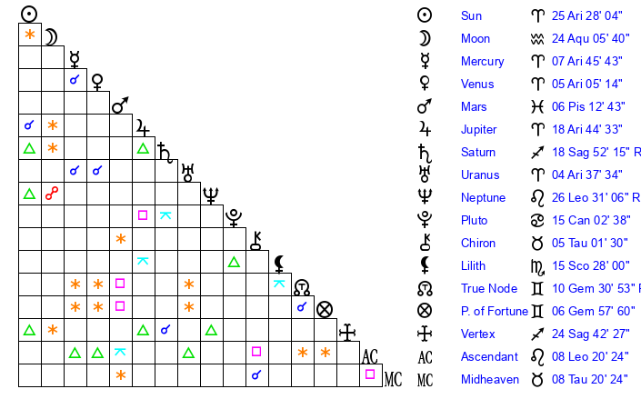 | Moon | 23 Aquarius 58 | 25 Scorpio 10 | 25 Virgo 55 |