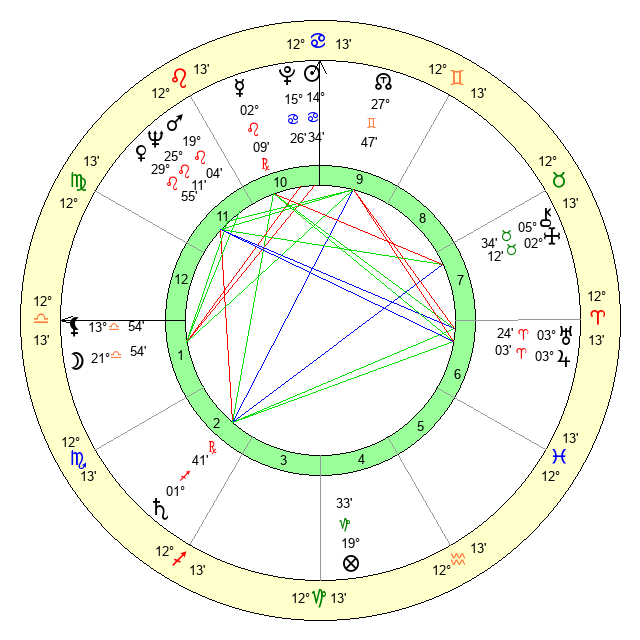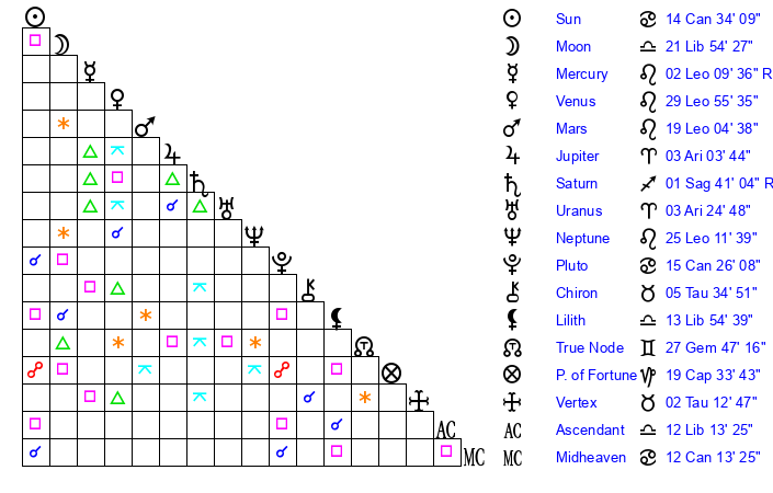 | Moon | 21 Libra 56 | 9 Sagittarius 30 | 29 Taurus 2 |
