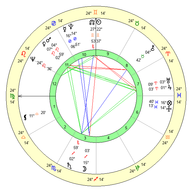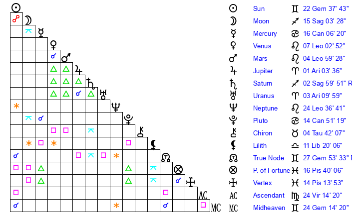 | Sun | 22 Gemini 38 | 23 Gemini 53 | 26 Virgo 44 |