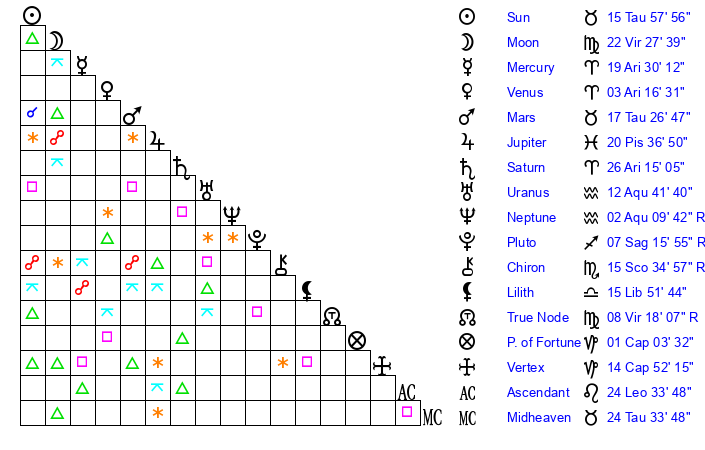| Sun | 15 Taurus 58 | 16 Taurus 25 | 11 Gemini 57 |