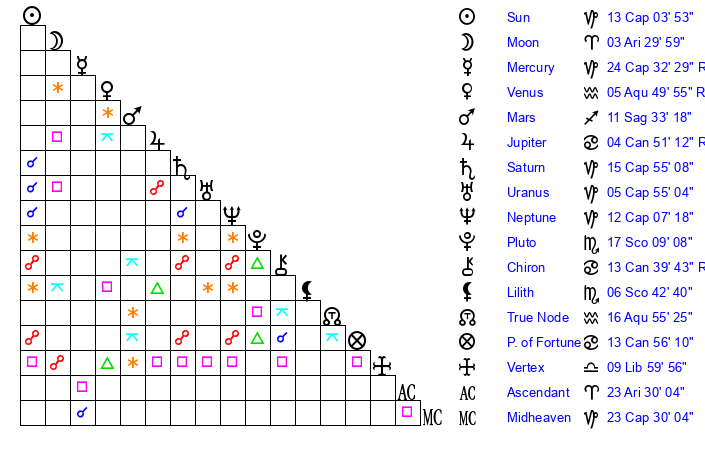 | Neptune | 12 Capricorn 7 | 29 Pisces 32 | 13 Capricorn 24 |