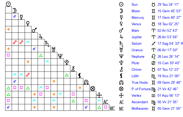| Moon | 15 Gemini 46 | 2 Pisces 27 | 28 Sagittarius 0 |