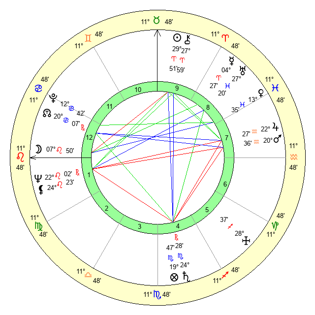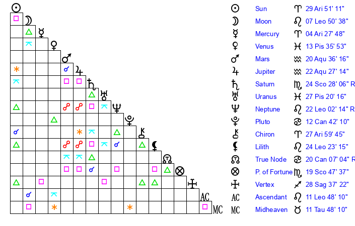 | Sun | 29 Aries 51 | 0 Taurus 52 | 4 Leo 50 |