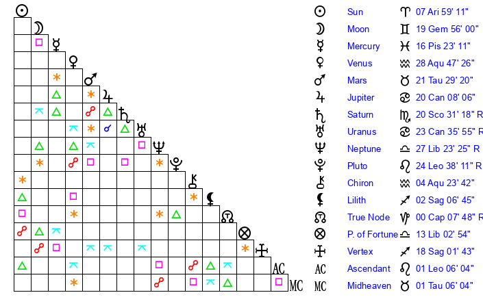 | Sun | 7 Aries 59 | 9 Aries 0 | 15 Gemini 55 |