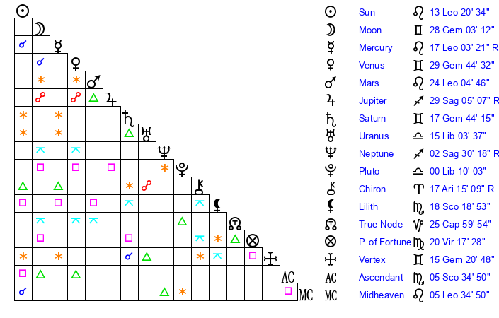 | Moon | 27 Gemini 56 | 29 Sagittarius 56 | 6 Gemini 52 |