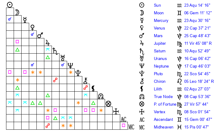 | Mercury | 23 Aquarius 30 | 26 Aquarius 44 | 11 Aries 17 |