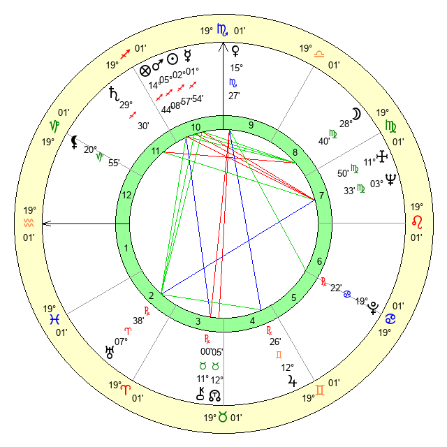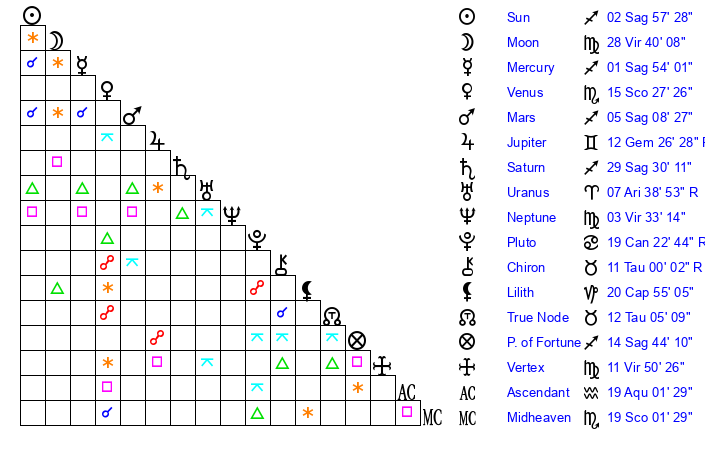 | Neptune | 3 Virgo 34 | 29 Pisces 25 | 1 Virgo 59 |