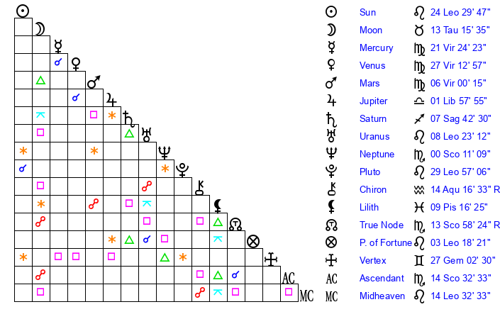 | Pluto | 29 Leo 56 | 2 Aquarius 2 | 1 Virgo 54 |