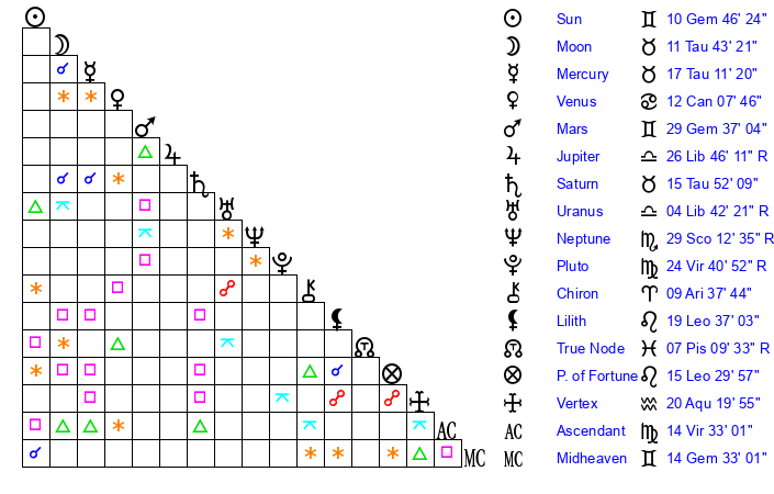 | Sun | 10 Gemini 46 | 11 Gemini 27 | 3 Leo 17 |