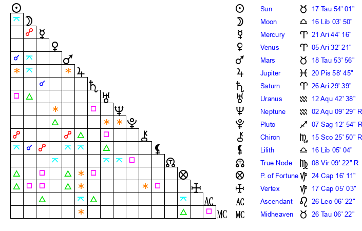 | Saturn | 26 Aries 18 | 28 Pisces 30 | 29 Aries 21 |