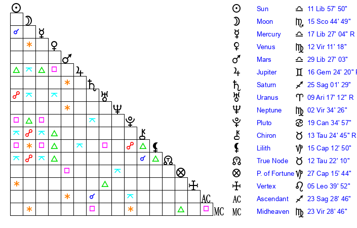 | Venus | 12 Virgo 11 | 19 Virgo 52 | 12 Capricorn 1 |