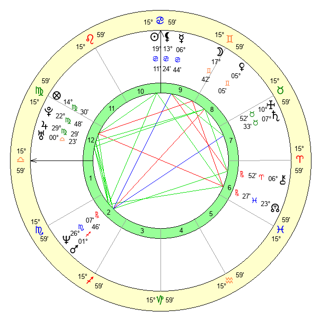 | Sun | 19 Cancer 12 | 19 Cancer 38 | 12 Virgo 56 |