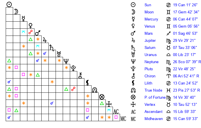 | Moon | 17 Gemini 38 | 29 Capricorn 53 | 5 Cancer 3 |