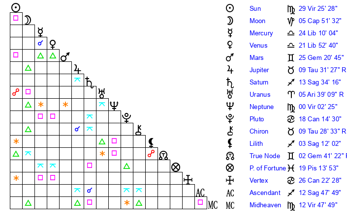 | Neptune | 0 Virgo 3 | 0 Aries 46 | 1 Virgo 13 |
