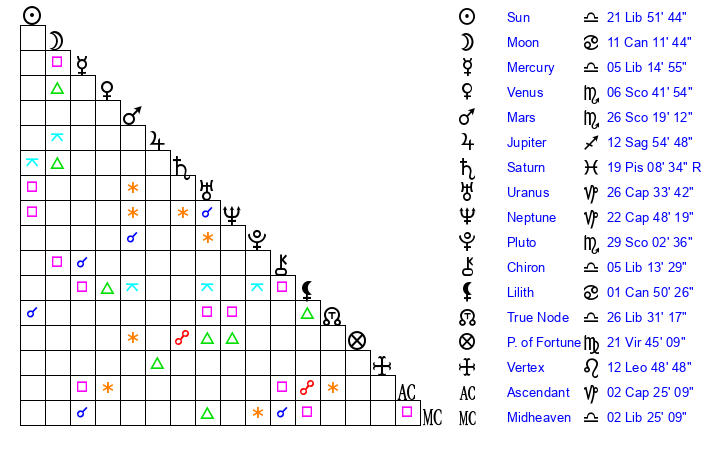 | Sun | 21 Libra 52 | 22 Libra 35 | 21 Scorpio 51 |