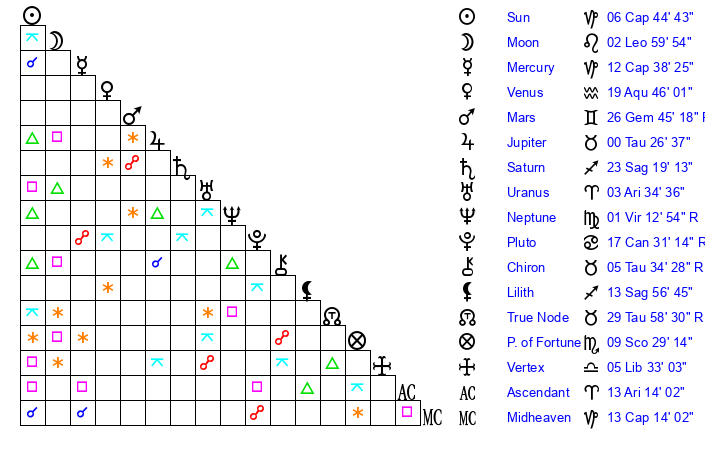 | Moon | 2 Leo 57 | 18 Aries 58 | 10 Aquarius 53 |