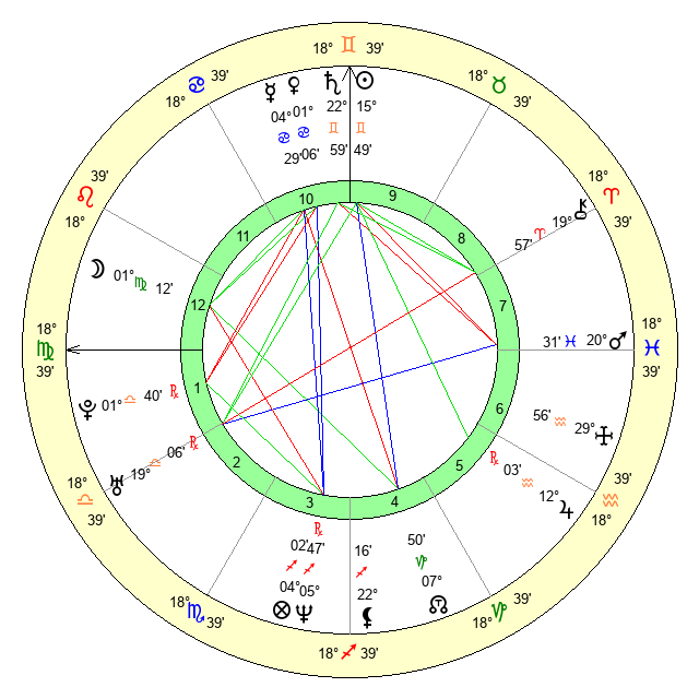| Moon | 1 Virgo 19 | 25 Libra 21 | 20 Cancer 22 |
