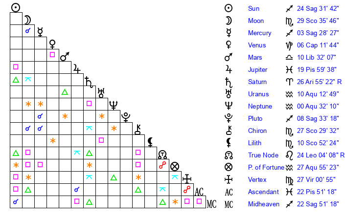 | Moon | 29 Scorpio 35 | 12 Cancer 38 | 13 Scorpio 50 |
