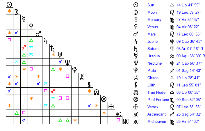 | Mercury | 27 Virgo 55 | 1 Scorpio 31 | 15 Scorpio 51 |