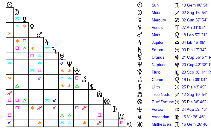 Moon | 2 Sagittarius 15 | 19 Virgo 43 | 4 Aquarius 0 |