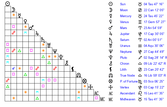 Sun | 4 Taurus 47 | 4 Taurus 46 | 2 Gemini 49 |