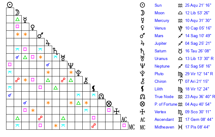 | Sun | 25 Aquarius 21 | 26 Aquarius 15 | 19 Aries 11 |