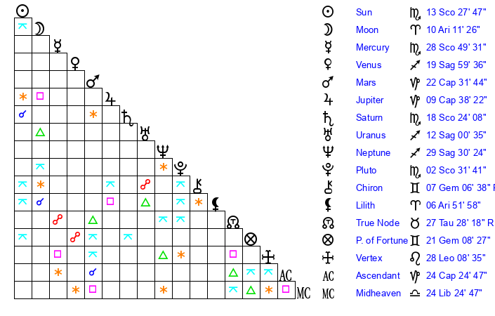 | Saturn | 18 Scorpio 41 | 25 Pisces 29 | 23 Scorpio 27 |