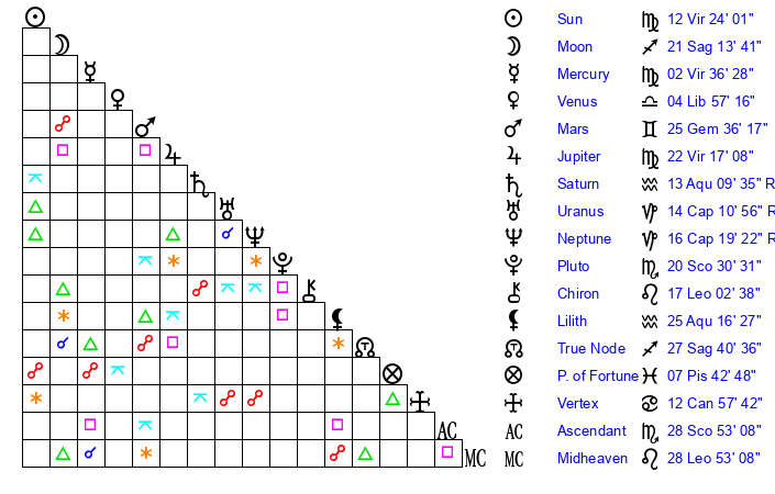 | Sun | 12 Virgo 24 | 12 Virgo 25 | 14 Libra 40 |