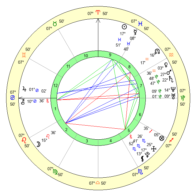 | Moon | 15 Leo 34 | 13 Cancer 43 | 20 Scorpio 38 |