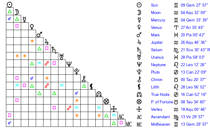 | Jupiter | 26 Aquarius 41 | 27 Gemini 56 | 19 Aquarius 17 |