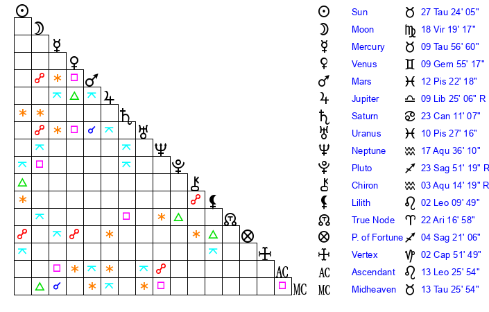 Sun | 27 Taurus 24 | 27 Taurus 34 | 16 Gemini 36 |