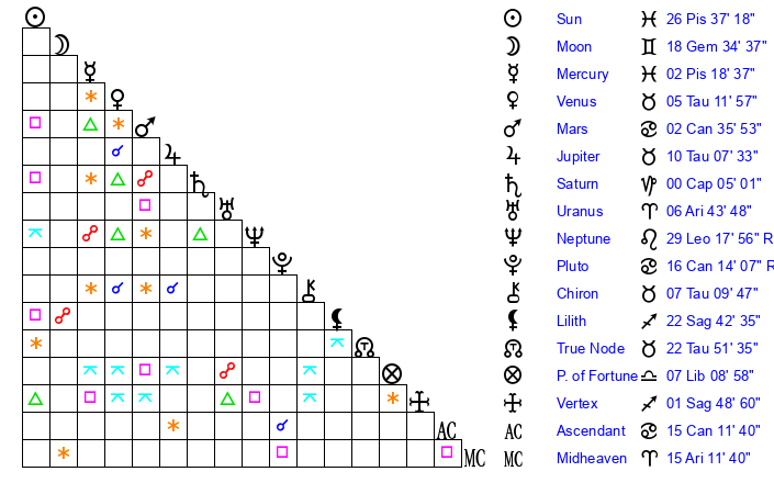 | Sun | 26 Pisces 37 | 27 Pisces 21 | 29 Gemini 48 |